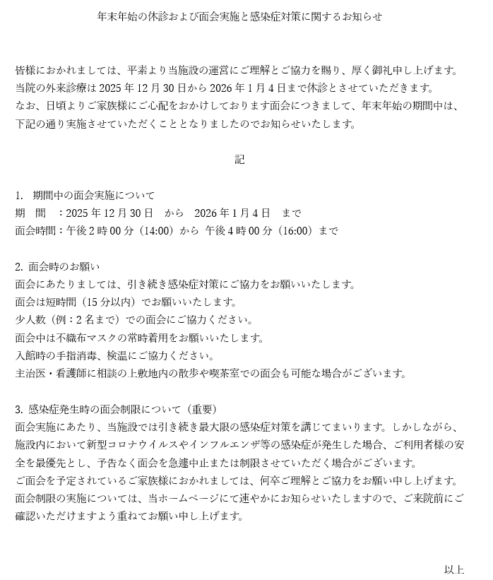 2025.12.22 年末年始の休診および面会実施と感染症対策に関するお知らせ